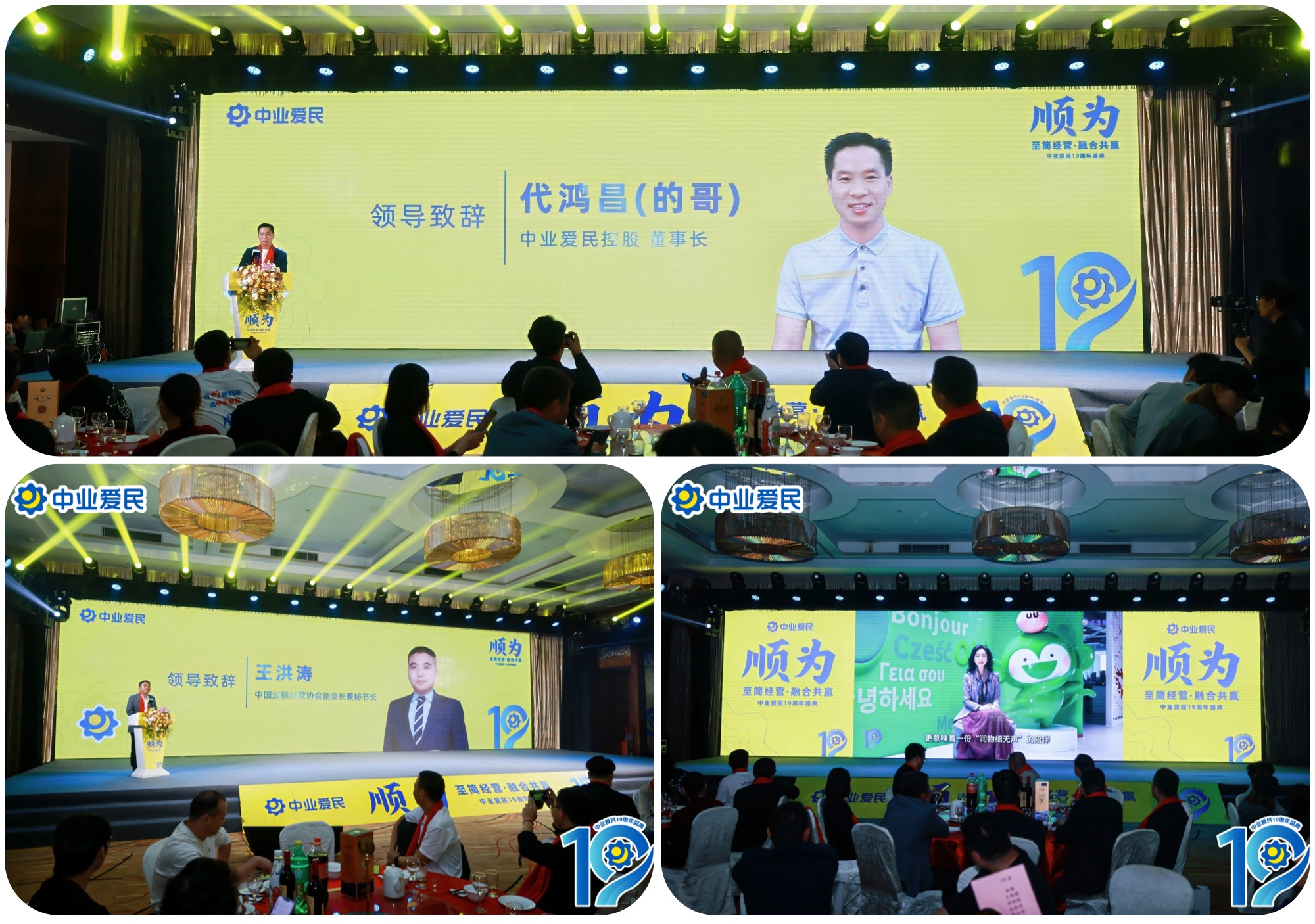 盛典伊始,中国连锁经营协会副会长兼秘书长王洪涛发表致辞,对中业爱民19年来在连锁便利店领域的深耕细作与卓越成就给予高度认可,同时展望行业发展趋势,鼓励中业爱民持续创新、稳步前行,为行业高质量发展贡献更大力量。随后,中业爱民控股董事长代鸿昌发表致辞,深情回顾品牌19年发展历程,从2006年第一家门店的初心启航,到如今连锁网络的全面布局,每一步成长都离不开伙伴们的同心聚力。此外,盛典还播放了百果园集团总裁徐艳林女士、金蝶软件(中国)有限公司深圳分公司副总经理周香凤女士等重要嘉宾寄语视频,来自各界的殷切祝福与期许,成为中业爱民前行的强大动力。