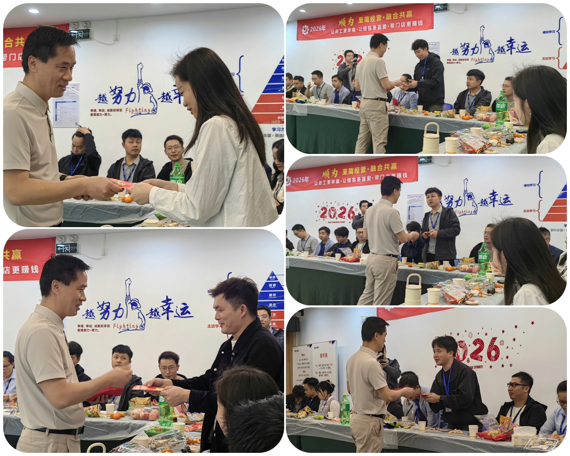 正如公司2026年“五三规划”所强调的,新的一年我们将继续深化“顺为”理念——顺应规律,顺势而为,以“至简经营·融合共赢”为根本抓手,全面推动数智化转型,用AI赋能门店,让高效运营成为常态。我们一切工作的出发点,始终围绕着不变的承诺:“让员工更幸福、让顾客更喜爱、帮门店更赚钱”。 此次茶话会,正是“融合”精神的生动体现:不同地域的文化在此交融,不同岗位的伙伴在此连接,彼此理解、彼此支持,共同汇聚成中业大家庭的温暖力量。